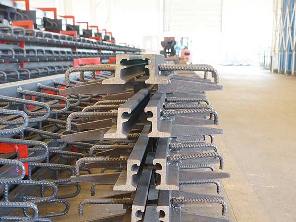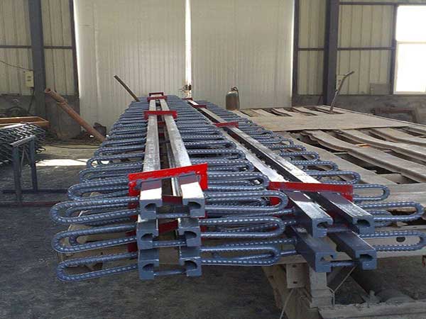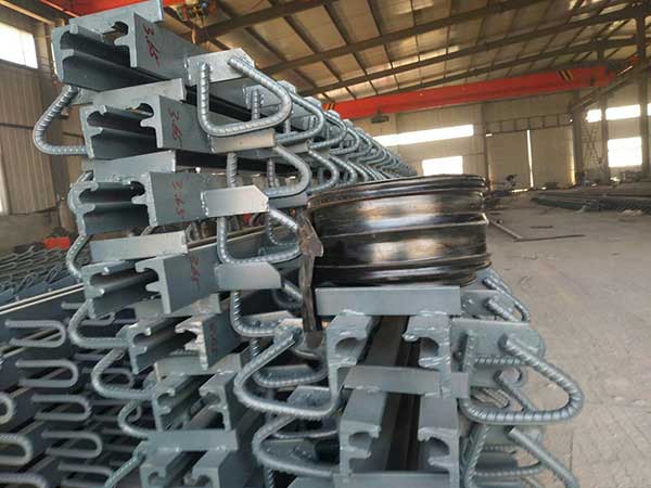由邊梁、中梁、橫梁、位移控制系統(tǒng)、密封橡膠帶等構(gòu)件組成的系列伸縮縫。該結(jié)構(gòu)還克服了斜向支承式伸縮縫要求加工和組裝精度相當(dāng)高的苛刻條件,否則四連桿結(jié)構(gòu)極易出現(xiàn)自鎖現(xiàn)象,影響伸縮自由和不易保證位移均勻的弊病。該結(jié)構(gòu)各連接處均采用既能轉(zhuǎn)動又能滑動結(jié)構(gòu)。所以,對彎、坡、斜、寬橋梁適應(yīng)能力強(qiáng),可滿足各種橋梁結(jié)構(gòu)使用要求。